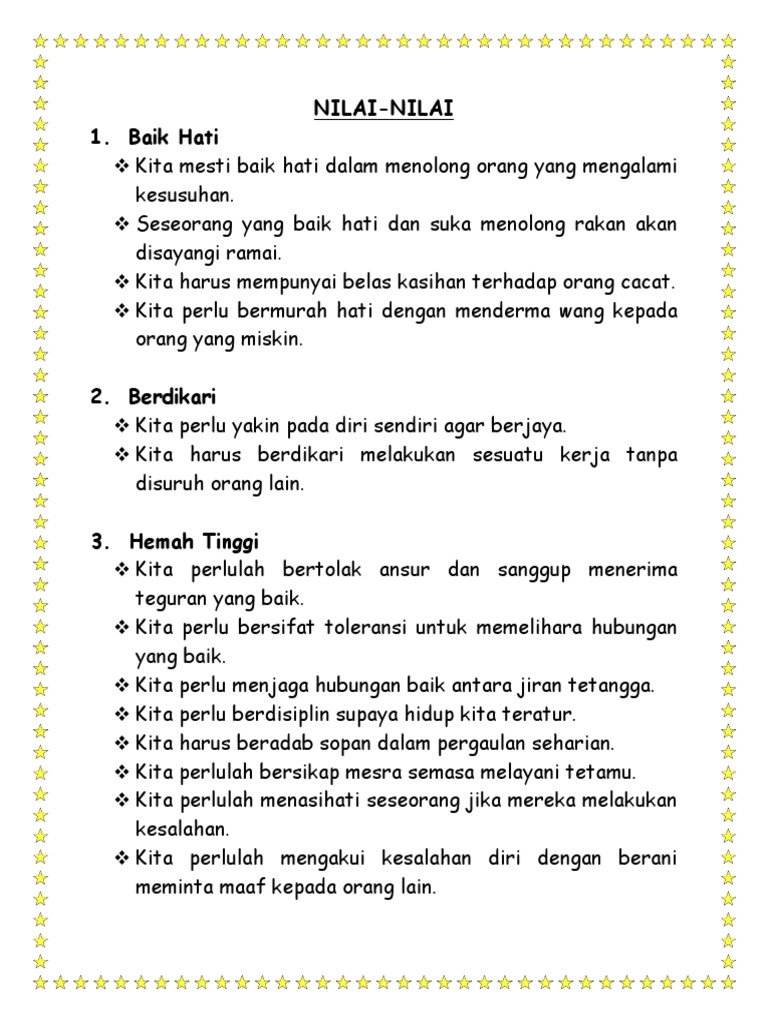 43 Sanggup berkorban untuk Negara. NILAI MURNI DAN HURAIAN. 37 rows Jadual di bawah adalah semua 36 nilai-nilai murni dan huraian dalam mata pelajaran.